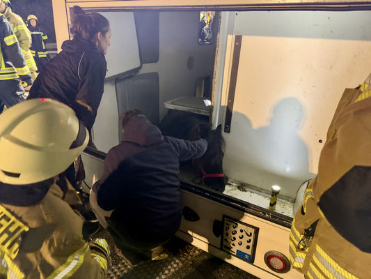 Erst nach der Gabe von Beruhigungsmitteln war es möglich, die Transportboxen gefahrlos zu öffnen und die Pferde schonend zu befreien. Gegen 22:30 Uhr konnten beide Tiere weitestgehend unverletzt gerettet und in einen bereitgestellten Pferdeanhänger umgeladen werden.
